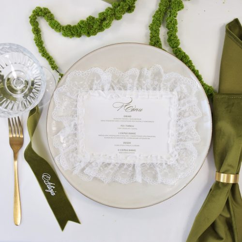 Menu ślubne koronkowe na papierze czerpanym Pistacjowe Wzgórze