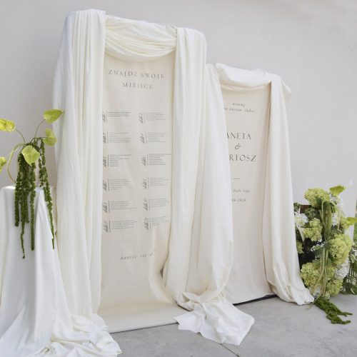 Tablice drukowane są na sztywnym, gładkim dibondzie, co gwarantuje trwałość, idealną płaskość i eleganckie wykończenie. W zestawie można połączyć plan stołów z tablicą powitalną i tablicą ze zdjęciem, tworząc kompletną, spójną aranżację wejścia.