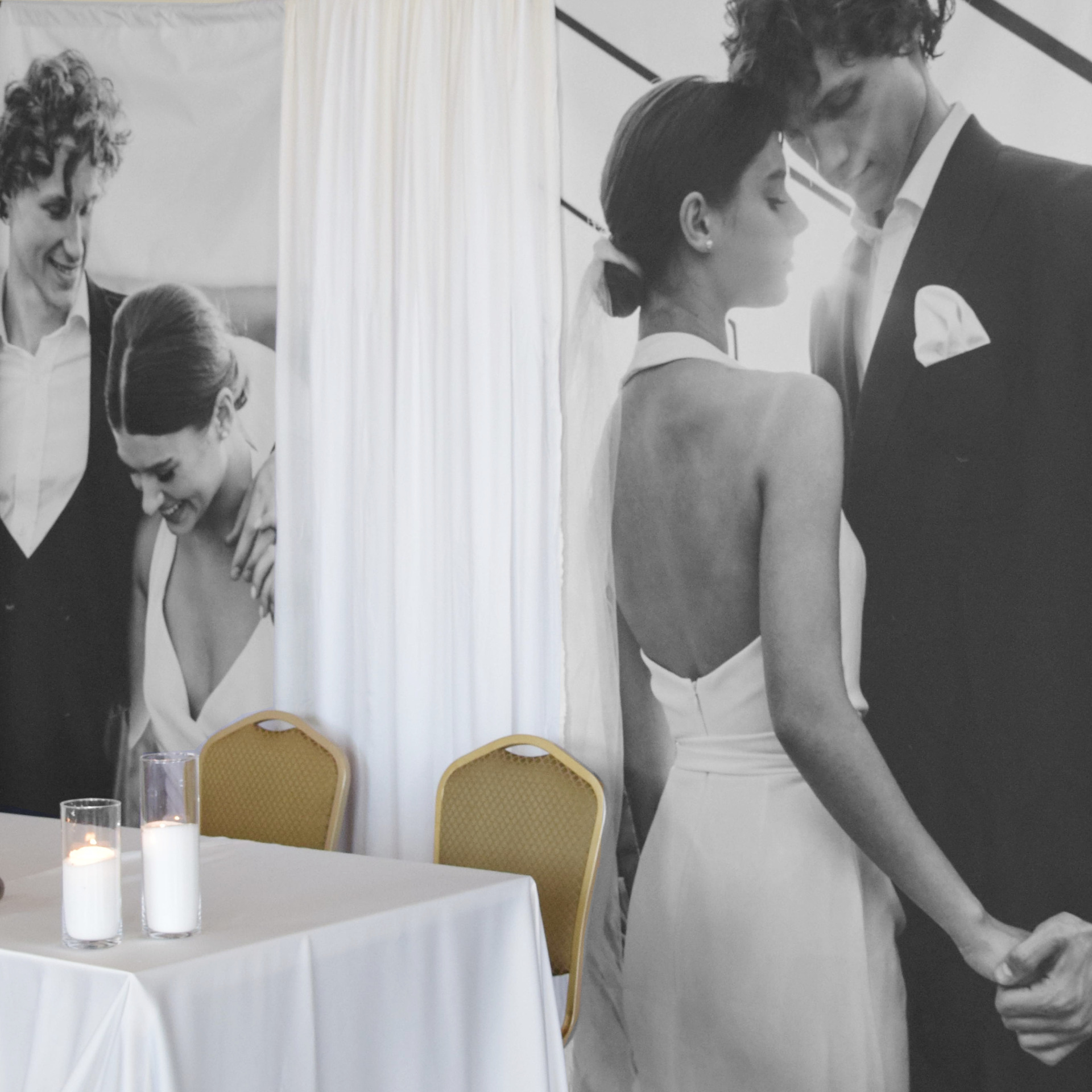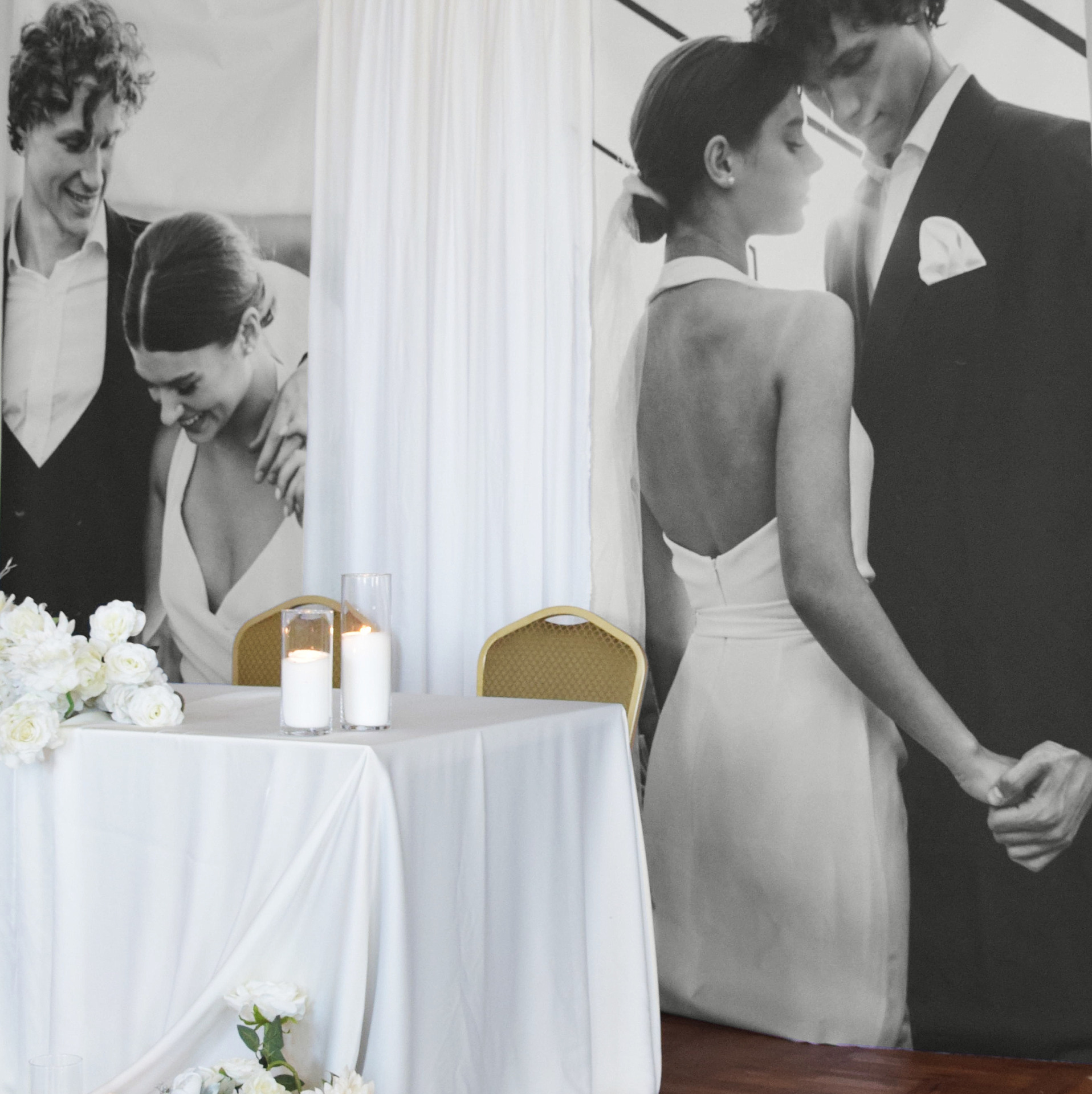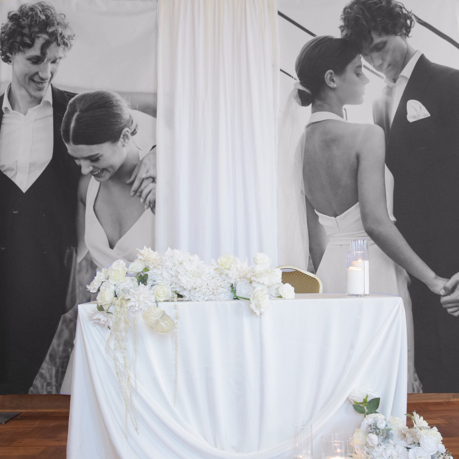 Zestaw składa się z dwóch dużych zdjęć Pary Młodej, które możesz wykorzystać na wiele sposobów – zawiesić za stołem nowożeńców, w strefie powitania, na tle do zdjęć lub po prostu jako subtelną ozdobę sali. To dekoracja, która nie narzuca formy – możesz z niej stworzyć elegancką ściankę ślubną, powiesić ją na rurce, karniszu lub lekkiej konstrukcji, a nawet wykorzystać w plenerze.