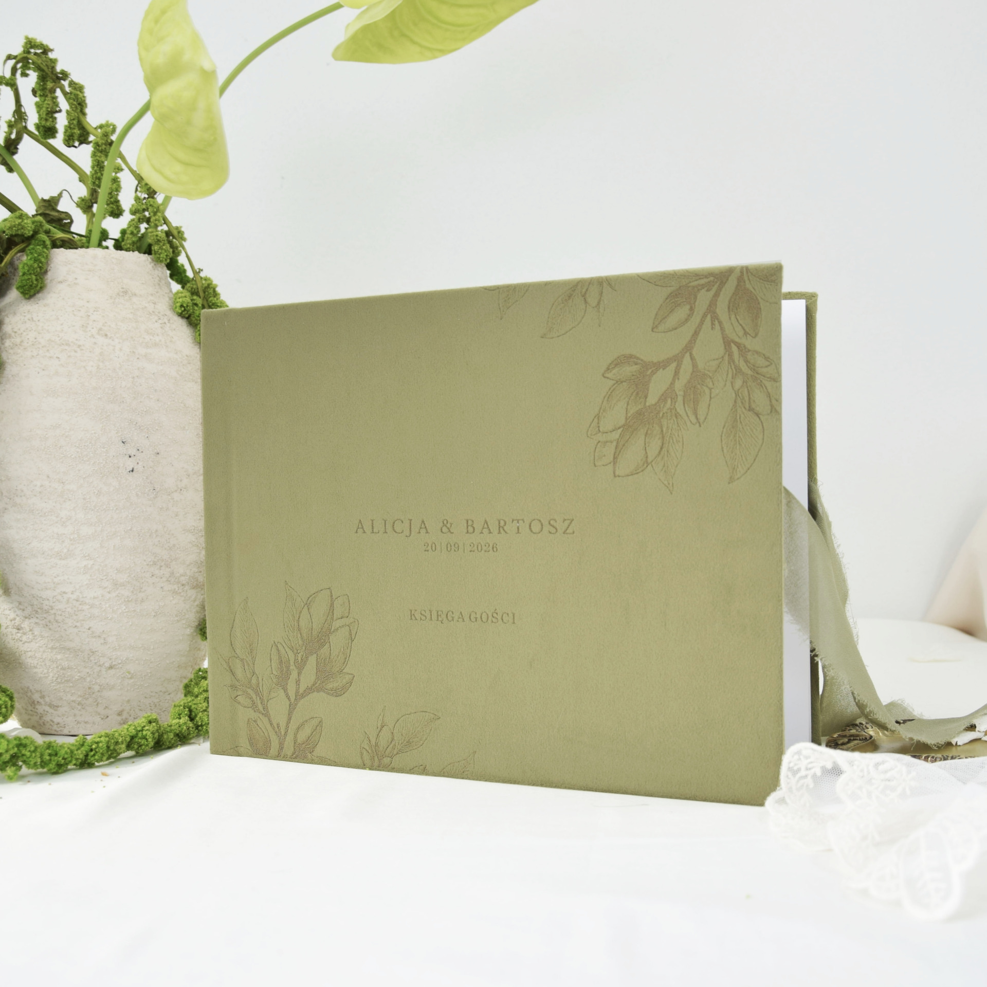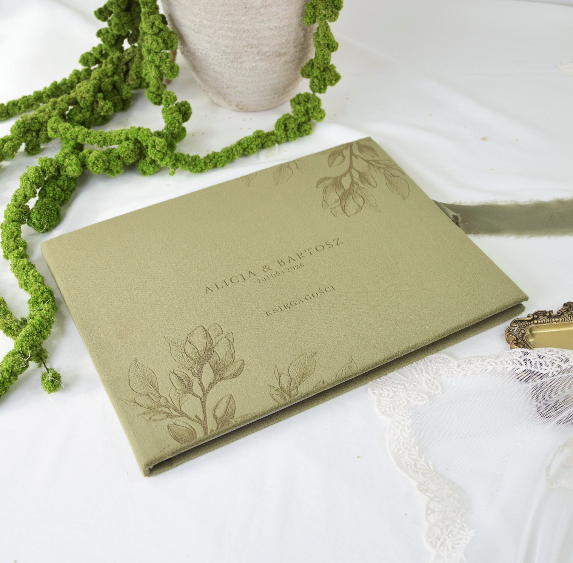 To nie tylko praktyczny produkt na ślub, ale także stylowa dekoracja i pamiątka pełna emocji. Księga gości  „Gałąź Pistacji” łączy elegancję, subtelny wzór oraz modną kolorystykę, dzięki czemu doskonale wpisuje się w najpiękniejsze ślubne inspiracje.