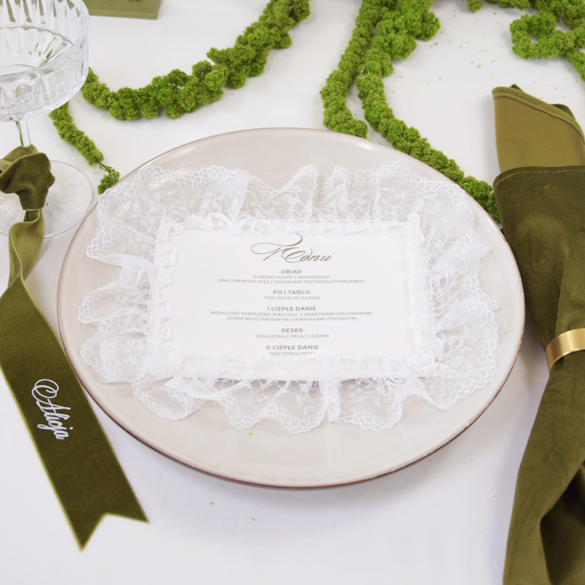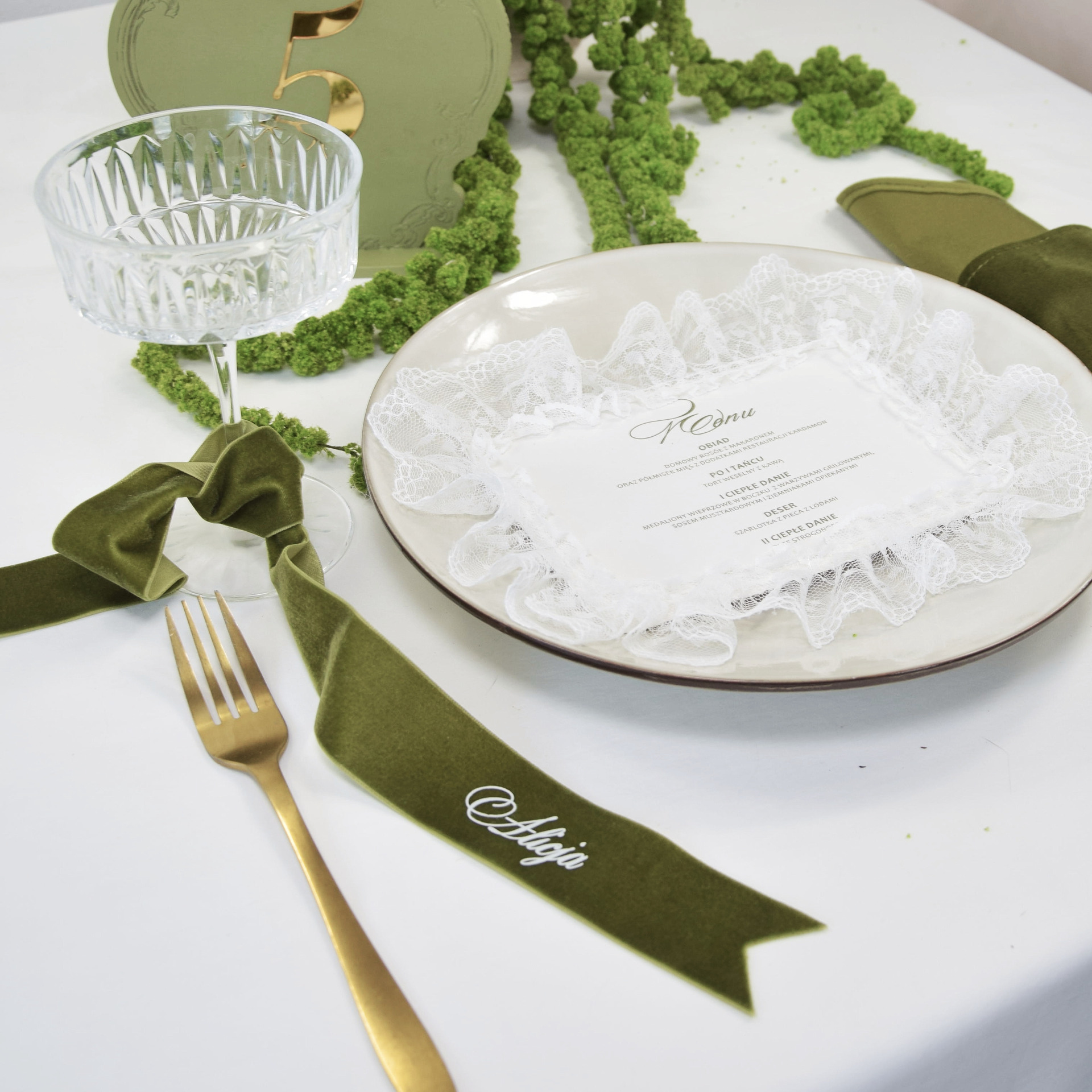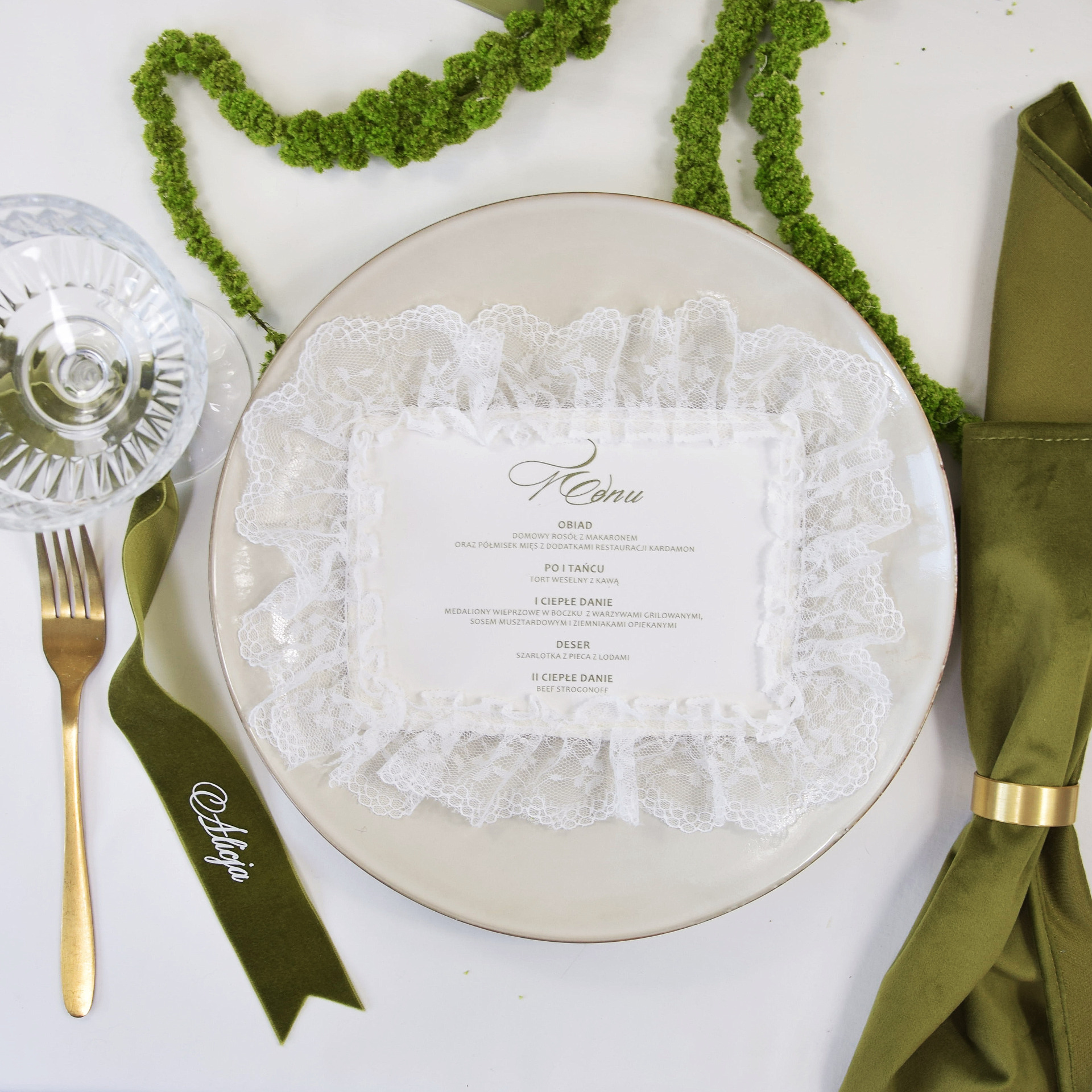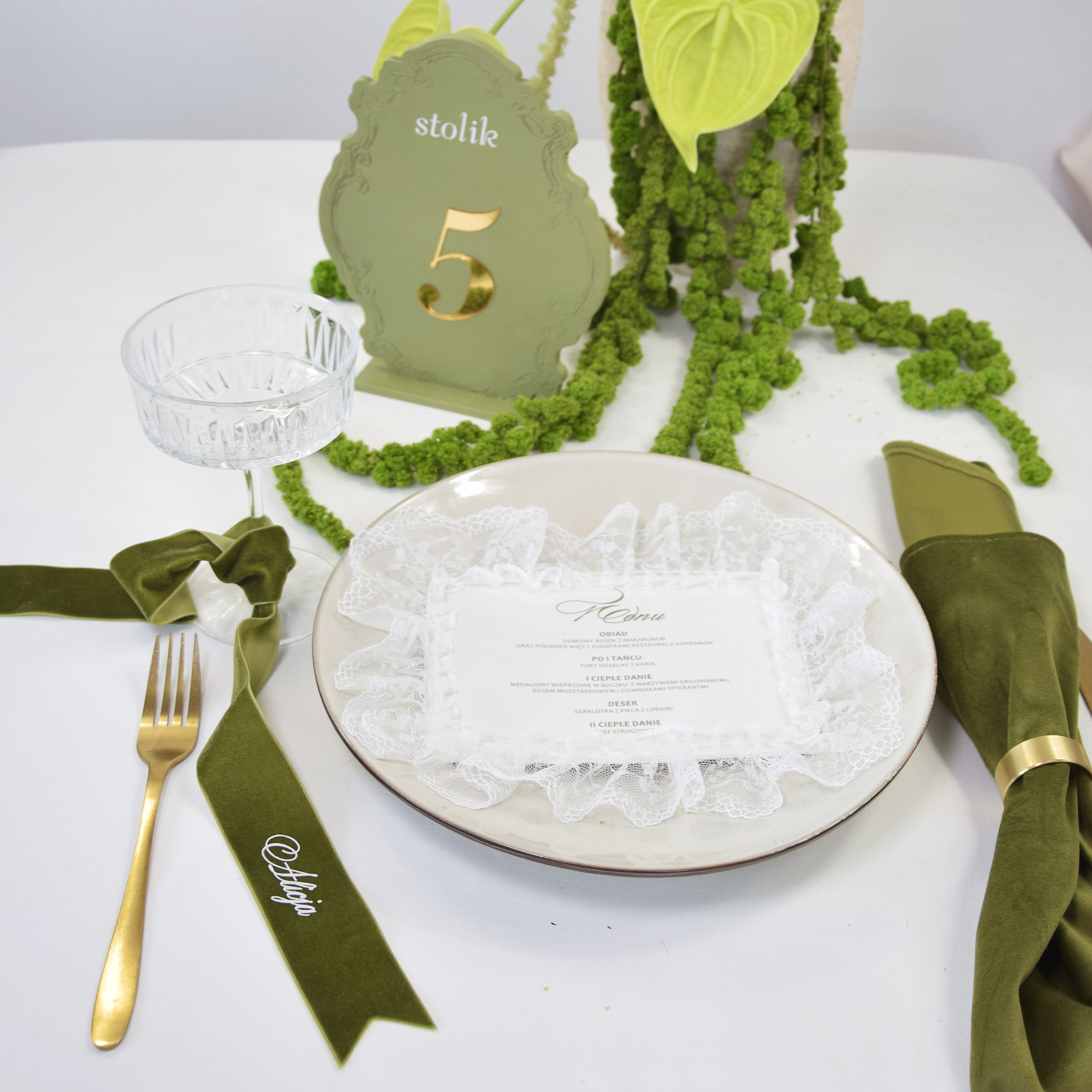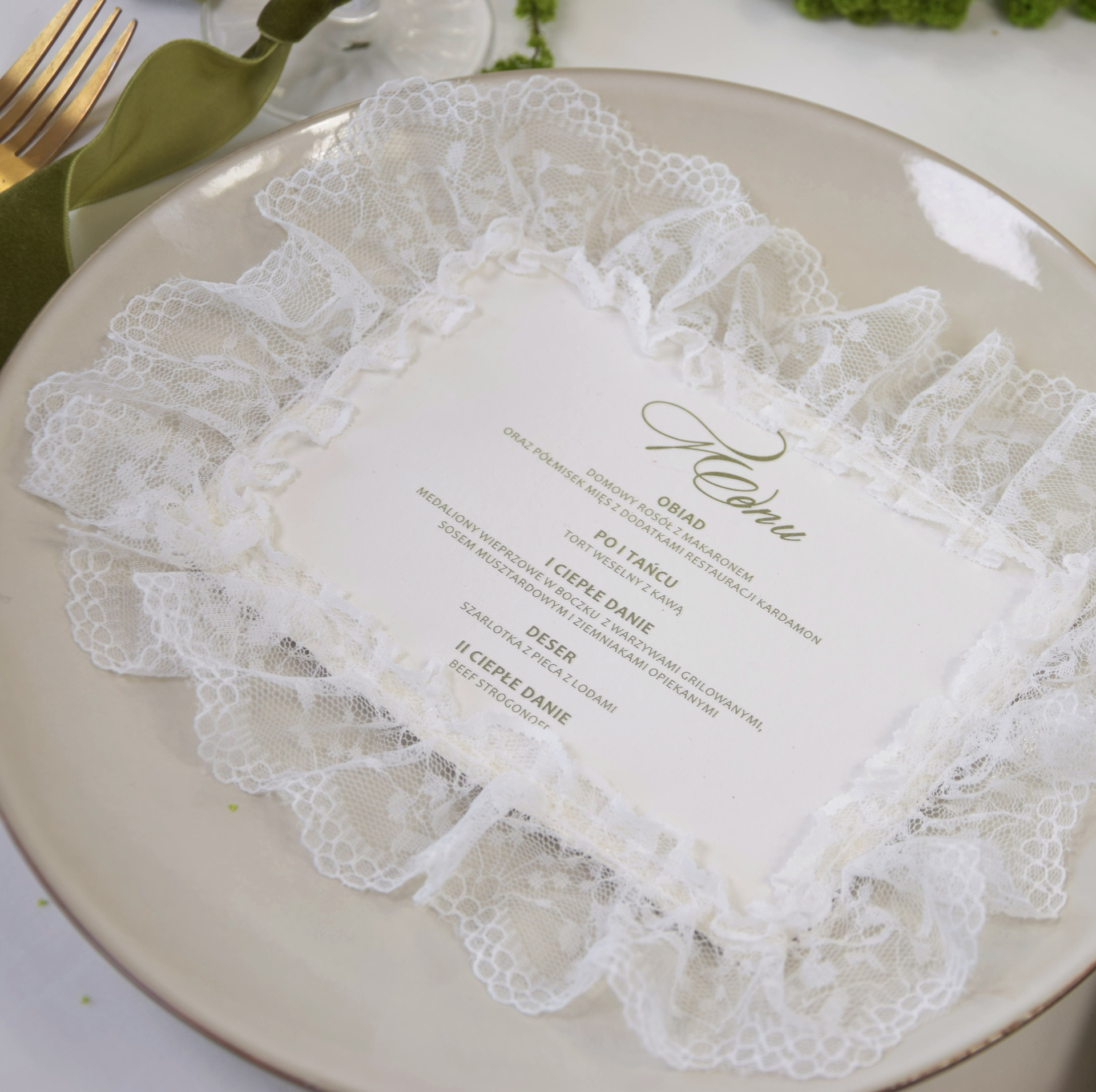 To menu ślubne idealnie komponuje się z aranżacjami stołów w kolorach oliwkowych, pistacjowych, beżowych i złotych. Doskonale współgra z lnem, koronką, świecami i naturalną zielenią, tworząc spójną i elegancką przestrzeń przyjęcia. Może być ułożone na talerzu, wkomponowane w serwetkę lub stanowić centralny element dekoracji miejsca dla gościa.