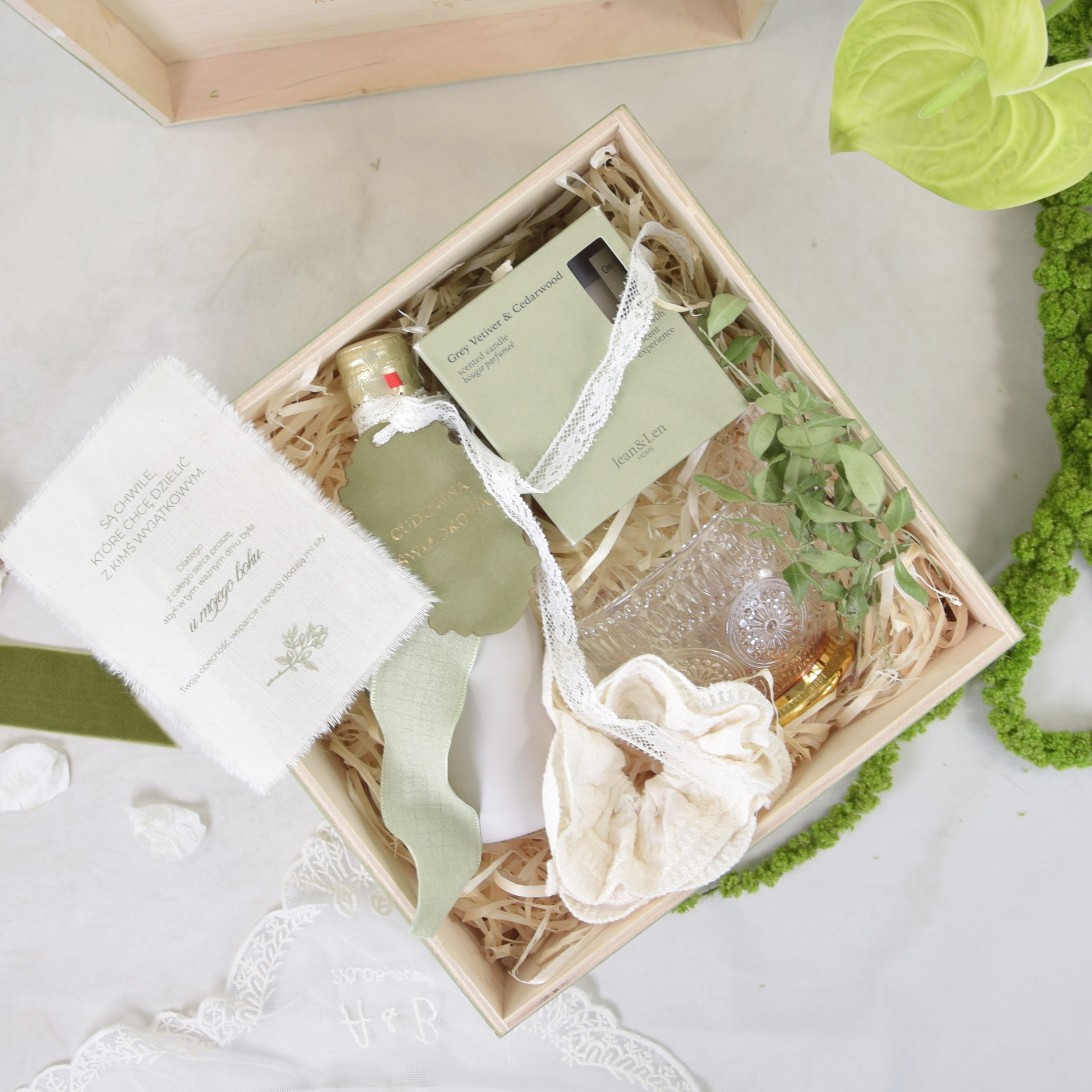 To nie jest zwykłe zaproszenie. To przemyślana prośba o świadkowanie, która buduje napięcie i wzruszenie. W środku znajduje się bawełniana kartka z dedykacją – to właśnie ona przekazuje najważniejsze słowa. Mini szampan bezalkoholowy symbolizuje wspólne świętowanie, świeczka wprowadza nastrój, filiżanka ze złotym sporkiem podkreśla elegancję, a haftowana gumka do włosów dodaje kobiecego charakteru całemu zestawowi.