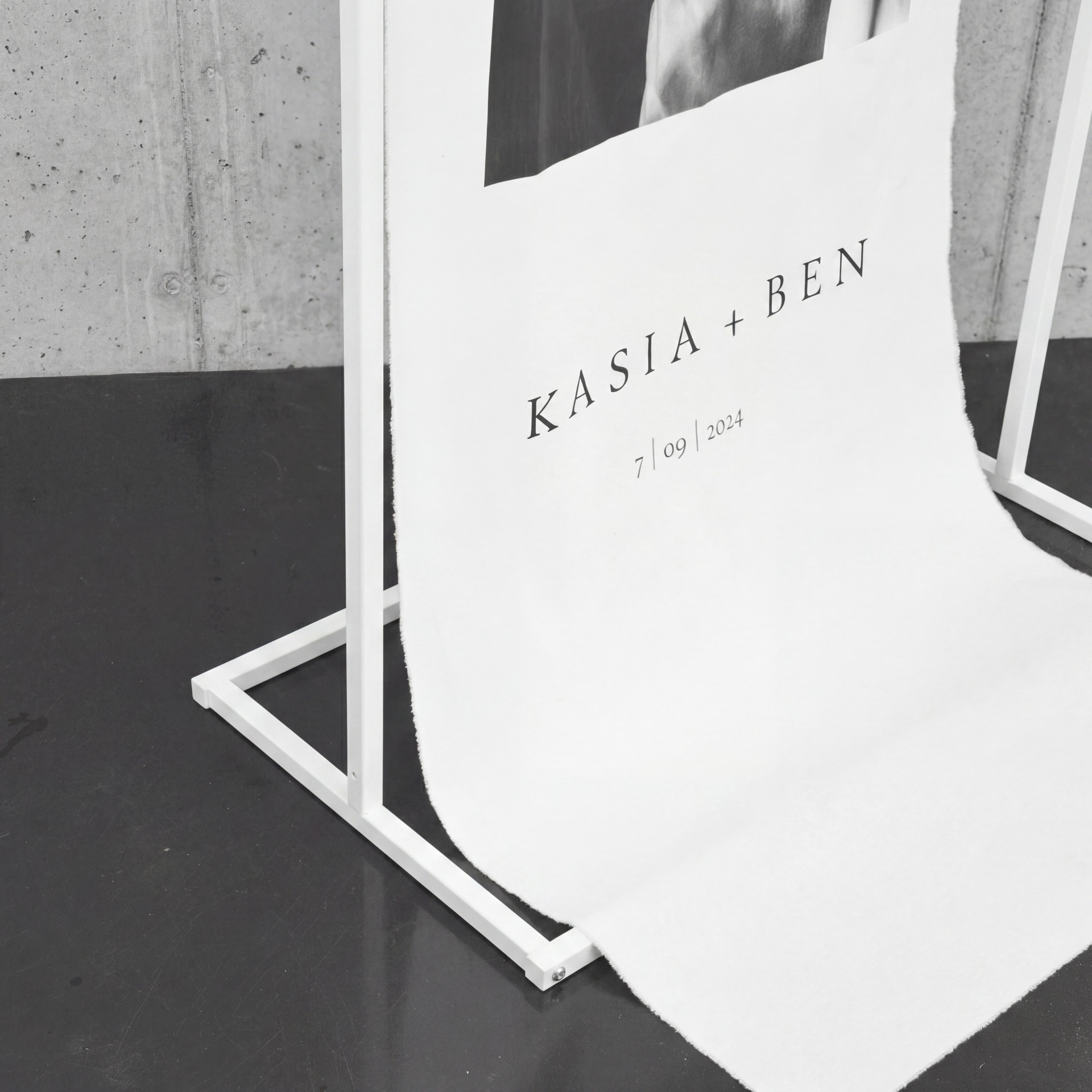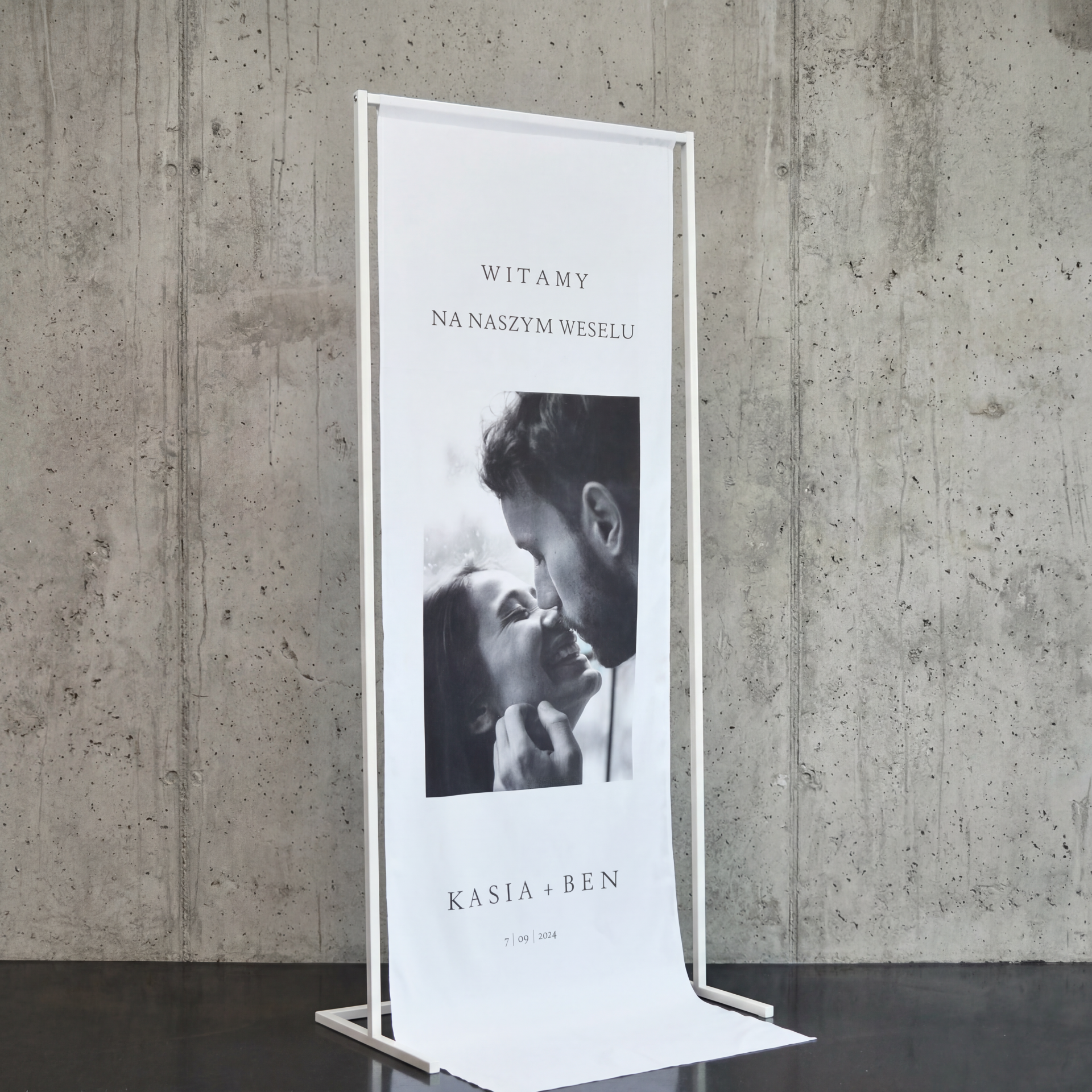 Ten stojak metalowy biały sprawdzi się jako baza pod tablicę powitalną, plan stołów, rozpiskę gości, tablicę ze zdjęciem Pary Młodej, cytat lub dekoracyjny baner z tkaniny. Jest też wygodny, gdy chcesz stworzyć komplet: powitanie + plan stołów w jednym stylu, ustawione obok siebie przy wejściu lub w strefie welcome.